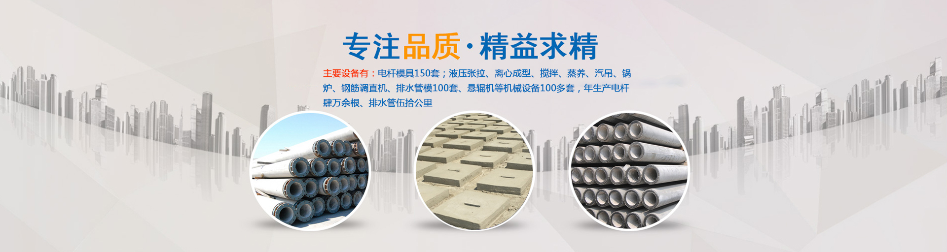公司主要生產ф100—ф430環形預應力混凝土電桿和ф190—ф550環形鋼筋混凝土電桿,以及ф300—ф1000排水管,主要設備有:電桿模具180套;液壓張拉、離心成型、攪拌、蒸養、汽吊、鍋爐、鋼筋調直機、滾焊機、排水管模100套、懸輥機等機械設備100多套,年生產電桿肆萬余根、排水管伍拾公里。……